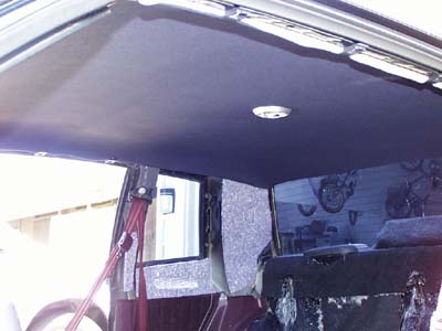 Here's a pic of the newly covered (black) ceiling panel. You can see that I also insulated the C-pillar and around the opera window. I had the ceiling panel re-upholstered at a local shop for $90 which was worth the price for me.. :-) |
