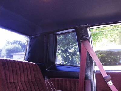 Here you can see the Opera window interior panel installed. This panel as well as most of the upper interior trim was painted with SEM Landau Black vinyl/plastic paint. As you can see I still need to do the door panels and get new Black seat belts. I'm waiting to get new front seats and then I will have the rear re-upholstered to match the material and color. |